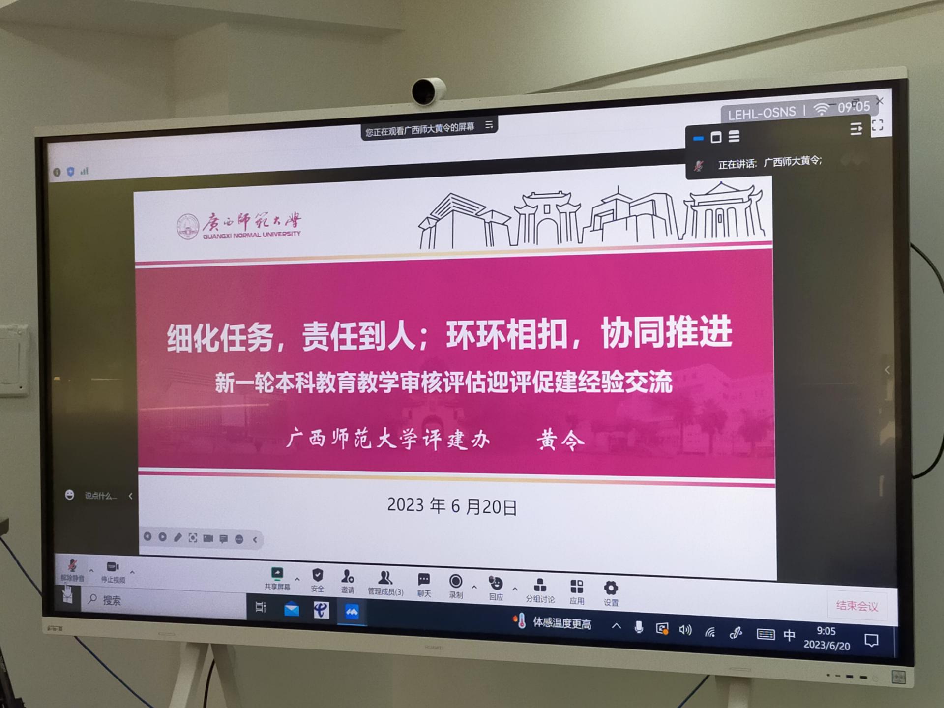 黄令主任作“细化任务、责任到人;环环相扣,协同推进——新一轮本科教育教学审核评估迎评促建经验交流”专题分享会。他主要从“评估人应树立的思想观念和调整的心态”“学校需要做的主要评建工作”“校内如何组织、分工和协调推荐”三个方面作详细的阐述。黄主任首先分析了我国“十四五”期间普通高校本科教学审核评估的整体计划,并结合广西师范大学审核评估的经历,传授如何自信从容地全面迎接教育部专家线上线下和入校评估考察审视。随后,他详细介绍了线上、线下各个评估阶段与流程,并对学校参与迎评的主要评建任务进行梳理,并重点介绍了广西师范大学材料准备工作的经验。最后,他从宣传动员阶段、自查自建阶段、自评整改阶段、接受评估阶段、评估整改阶段等五个方面分享了宝贵经验做法与设想。