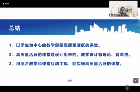 最后,费老师提出了高质量活跃课堂的标配:“线上线下混合式教学+课堂智慧工具应用”,表示其能解决内容多、学时少的问题,有助于“以学生为中心”的教学理念更新,极有可能提高课堂的活跃度,提升课程的高阶性和挑战度。老师们借助线上课程平台的学习过程管理和数据统计功能,能够更好激励、推动学生学习。
