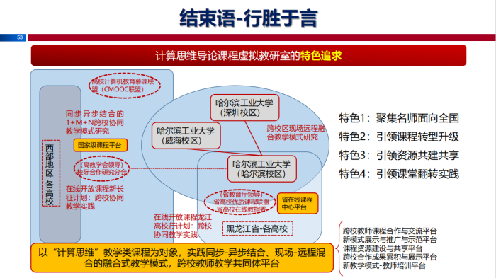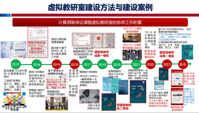 战德臣表示,虚拟教研室是信息化时代新型基层教学组织建设重要探索,建设任务主要是创新教研形态、加强教学研究、共建优质资源、开展教师培训,主要特征有名师引领、中心聚焦、平台支撑、共建共享、成果累积、协同教研、水平提升等。战德臣以其主持的教育部虚拟教研室项目——计算思维导论课程为例,介绍了协同发展历程、协同工作积累等,并详细阐述了完善平台各版块建设、协同教研、协同探索新型教学模式、教师培训会与教学研讨会等四项建设内容。战德臣凭借其丰富的教学经验和体会,将理论紧密联系实践,为寻求虚拟教研室的建设路径提出深刻见解。