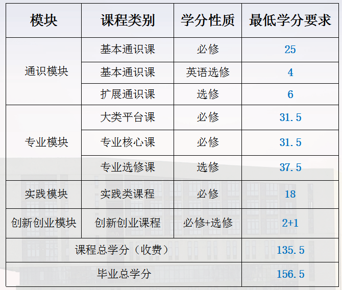 本专业总学分要求156.5学分,其中,通识课程学分为35学分,专业课程学分为100.5学分,实践类课程为18学分,创新创业模块为3学分。课程分类和毕业学分要求见下表。