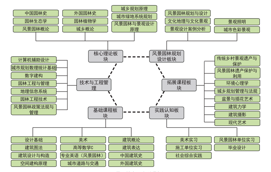 风景园林专业教学课程按六大板块“风景园林规划与设计”、“核心理论”、“基础课程”、“技术与工程管理”、“拓展课程”、“实践认知”设置。