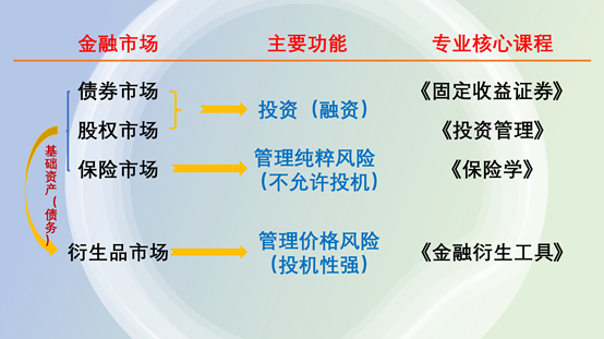 课程设置秉承沃顿商学院投资学课程体系及核心,围绕股权市场、债券市场、保险市场和衍生品市场开设《投资管理》、《固定收益证券》、《保险学》、《金融衍生工具》、《金融机构风险管理》、《公司估值》、《融资与并购》等专业核心课程;同时开设经济学类(《宏观经济学》、《微观经济学》、《政治经济学》等)、数学类(《高等数学》、《线性代数》、《概率论》、《统计学》等)、财务学类(《财务会计》、《管理会计》、《财务报表分析》、《公司理财》等)、管理学类(《管理学原理》、《风险管理》等)等基础和拓展知识模块;模块化、分级课程体系设置,不仅可以培养学生完整的知识体系和思维逻辑,还可兼顾学生的个性化发展,更好适应市场对人才的需要。课程教学采用中英双语教学,大部分专业核心课程采用英文原版教材。课程专任教师大多具有海外留学经历或外教,确保双语教学的质量。