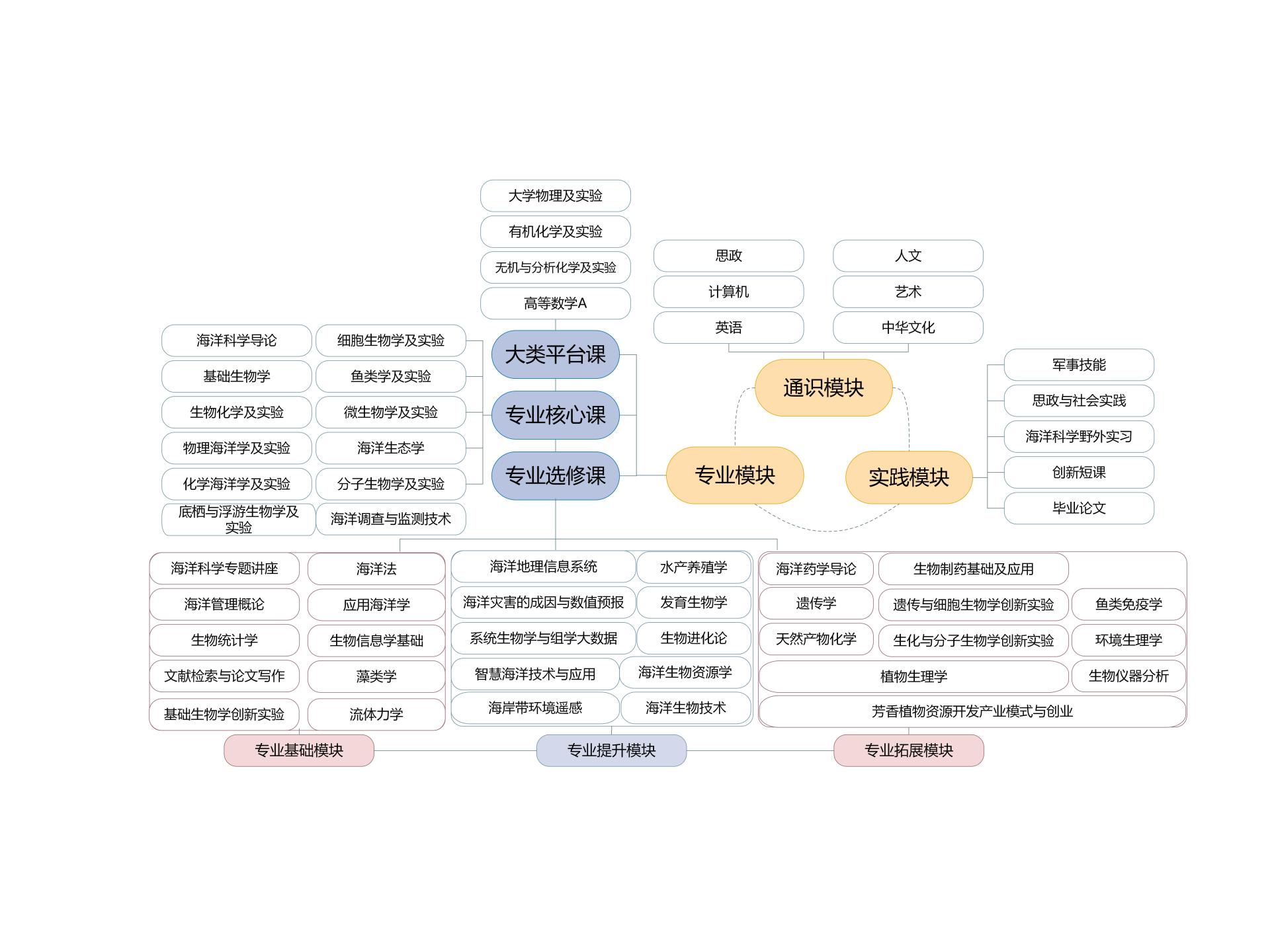 专业选修课程要求完成不少于21学分的课程,根据专业培养目标设计了海洋科学基础课程,生物海洋学提高课程,物理海洋学提高课程,和海洋环境学提高课程四个模块。其中海洋科学基础课程包括海洋科学专题讲座、海洋管理概论、生物统计学、文献检索与论文写作、海洋法、海洋科学热点问题、专业英语等课程;生物海洋学提高课程包括生物信息学、植物生理学、藻类学、系统生物学与组学大数据、发育生物学、遗传学、天然产物化学、海洋药学导论、海洋生物技术等课程;物理海洋学提高课程包括海洋地理信息系统、海洋灾害的成因与数值预报、应用海洋学、智慧海洋技术与应用、海岸带环境遥感等课程;海洋环境学提高课程包括环境生物学、海洋调查与检测技术、水产养殖学、海洋生物资源学、环境生理学等课程。