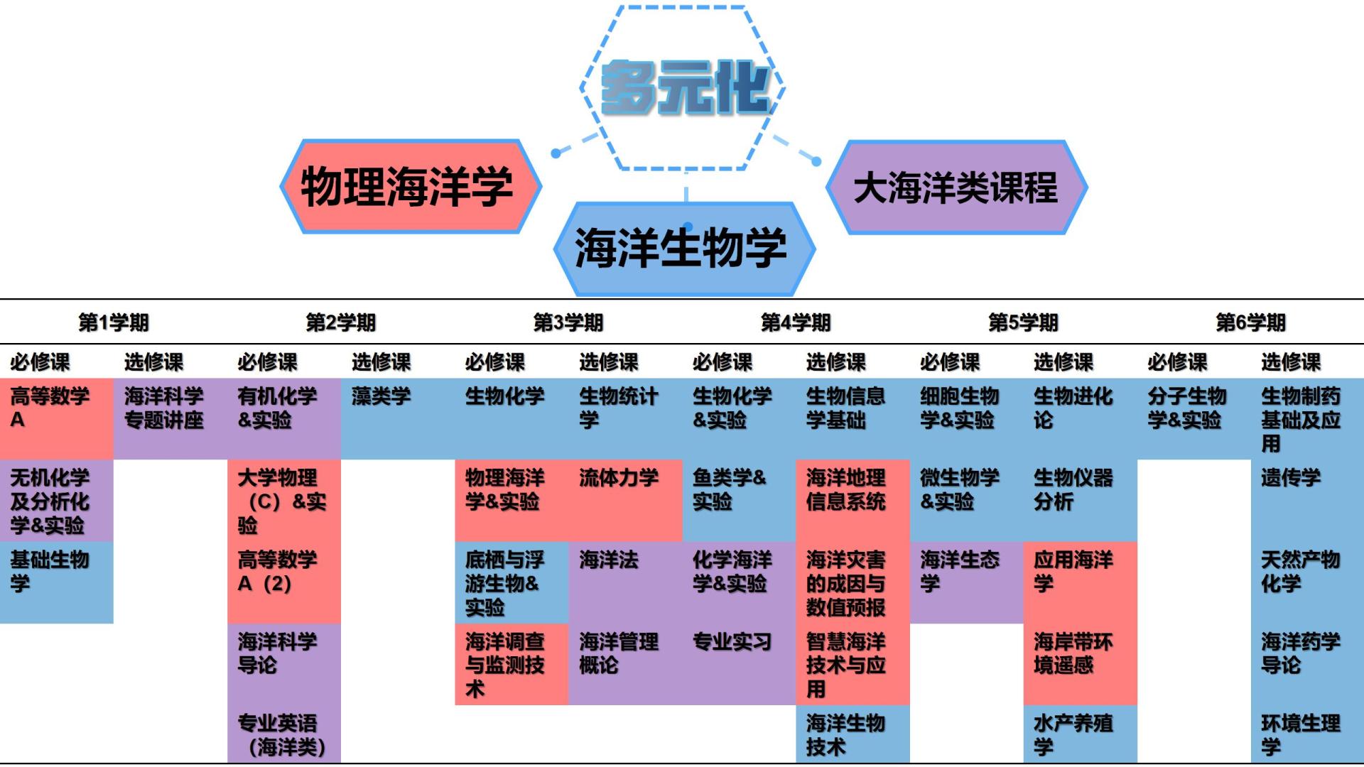 专业核心课程共45学分,包括物理海洋学、海洋生物学、大海洋类三大课程体系。其中海洋生物学包含基础生物学、生物化学、微生物学、细胞生物学、底栖与浮游生物学、分子生物学、鱼类学等多门理论课及其实验;物理海洋学包含物理海洋学及其实验、海洋调查与监测技术等;大海洋类课程包括海洋科学导论、化学海洋学及其实验、海洋生态学。