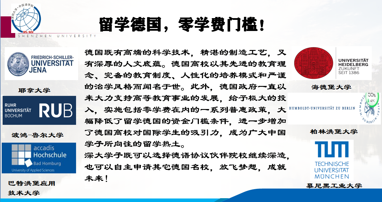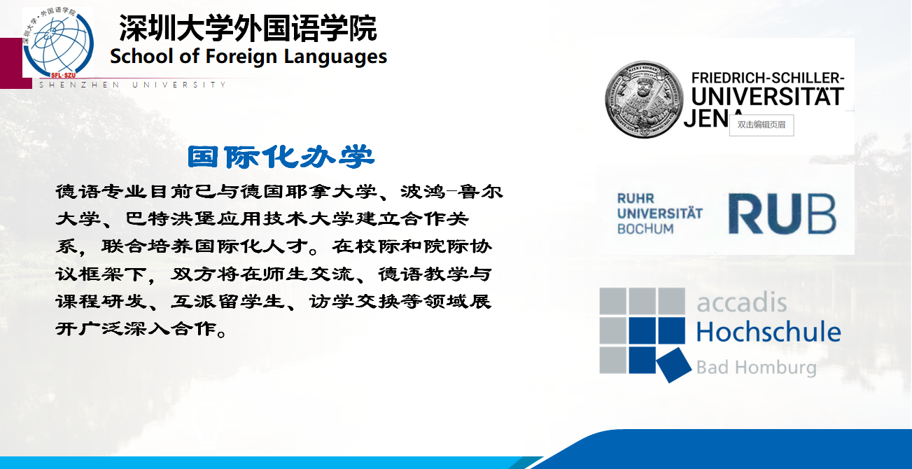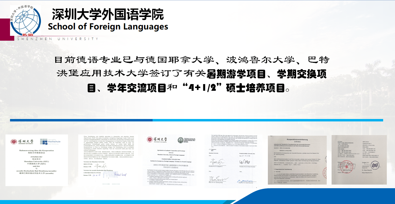 目前深圳大学已与德国艾尔兰根-纽伦堡大学、科隆应用科技大学、慕尼黑造型艺术学院、汉诺威莱布尼兹大学建立了校际合作关系。在此基础上,外国语学院德语专业还与德国耶拿大学、波鸿鲁尔大学、巴特洪堡应用技术大学签订了有关暑期游学项目、学期交换项目、学年交流项目和“4+1”、“4+2”硕士培养项目协议。