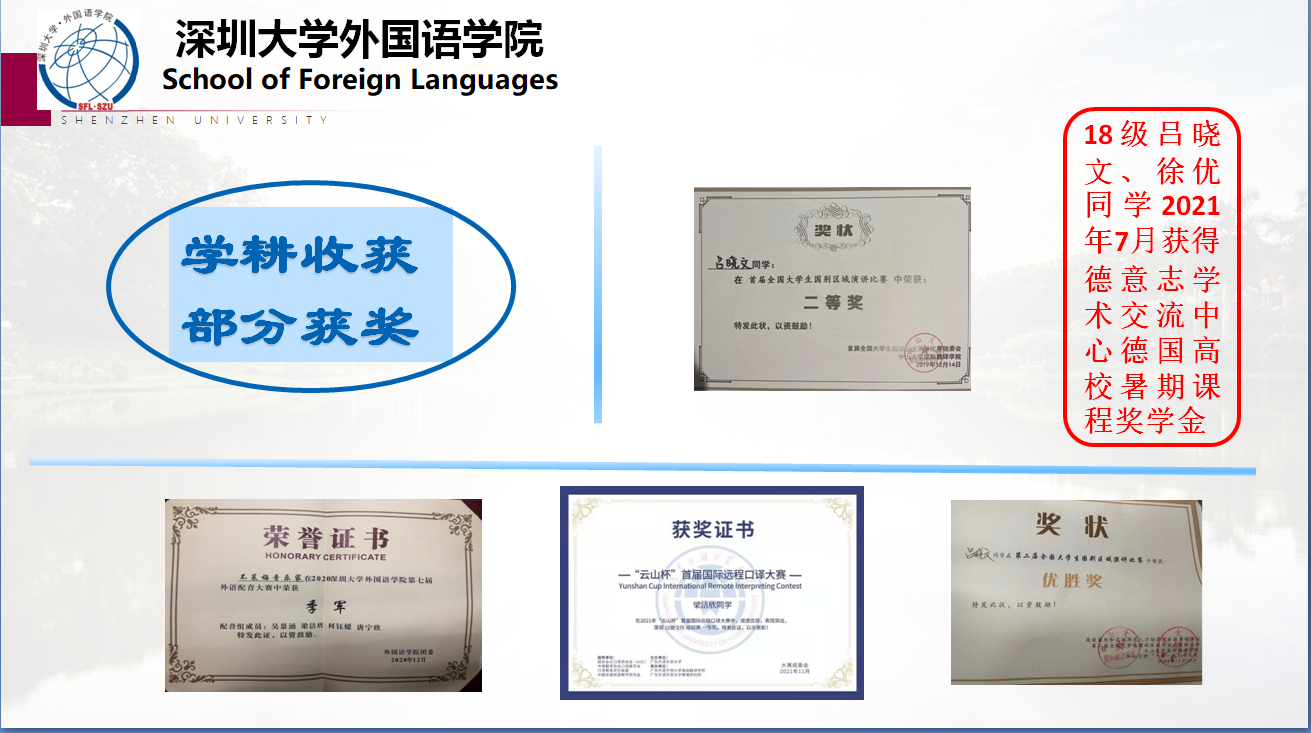 在专业知识方面,德语专业要求学生掌握并熟练运用德英两门外语,在制定专业人才培养方案时,除强调德语作为第一外语的语言知识与应用能力外,还注重对学生第二外语——英语的知识能力培养。课程体系包含了德英两个语种的核心与特色课程,发挥德语与英语“同源同构”的学习优势,顺应时代对外语人才的新要求,实践“德语+英语”复语人才培养模式。同时,深圳大学学科门类齐全、管理制度灵活创新,鼓励学生跨学科辅修、选修其它专业,积极探索“外语+”的专业复合型人才路径,为深圳发展和粤港澳大湾区建设培养“通人文、晓外语、懂专业”的综合性外语人才。