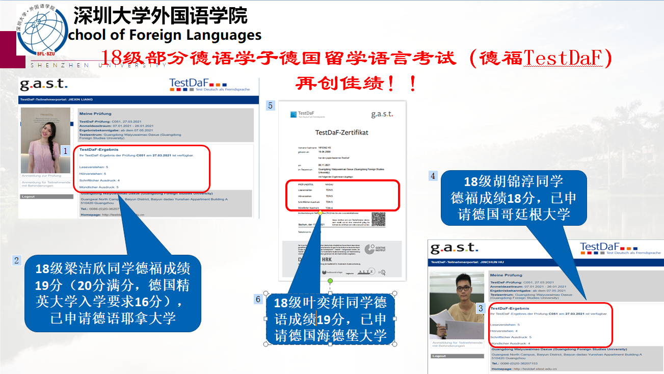 德语班同学获得高分德福成绩(满分20分,16分及以上语言能力可申请德国精英高校)