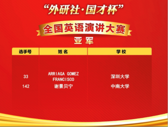 2021年12月Arriaga Gomez Francisco获“外研社●国才杯”英语演讲国家特等奖;