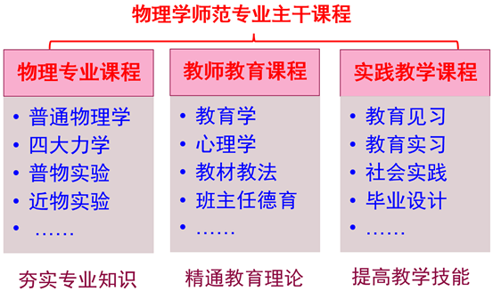 (2)基础扎实,精通教学。具有扎实的物理学知识、较强的物理思维能力和物理实验技能,了解物理学发展的总体趋势;具有系统的教育理论和较强的教学技能;能够结合物理专业知识和教育教学知识独立地进行物理教学设计和教学评价等教学活动。