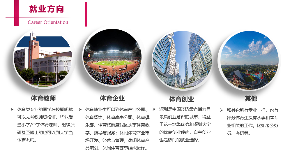 深圳是中国休闲体育产业发展的排头兵,致力于建设国际著名体育城市和国家体育消费试点城市,对休闲体育专业人才需求旺盛。本专业长期与深圳及大湾区政府部门、企事业单位、社会组织保持密切沟通,追踪了解经济与社会发展和用人单位的新动态和新需求,在课程设置、教学内容和手段、实践教学环节等各个方面不断快速迭代,快速前进。