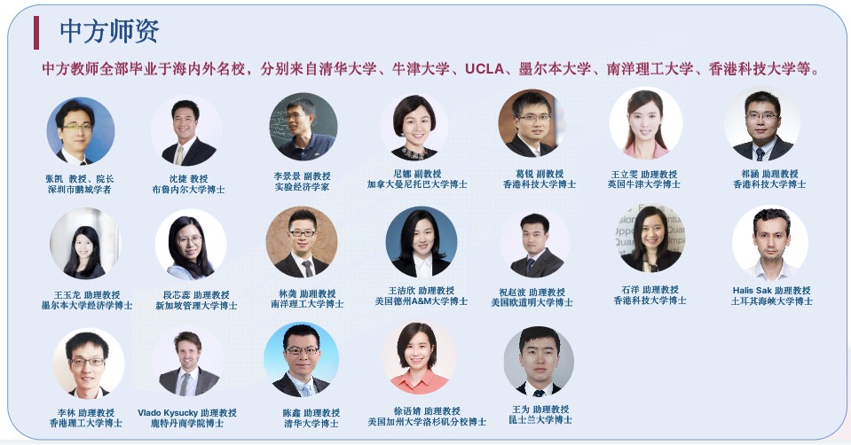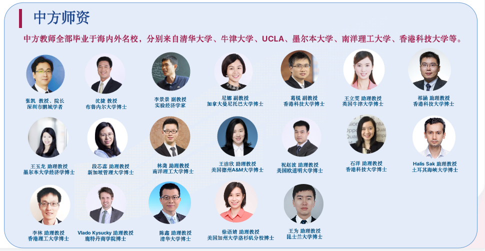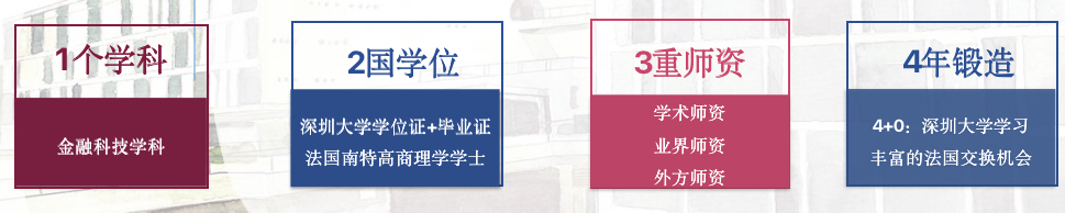 国际化师资队伍 - 深圳大学深圳南特金融科技学院拥有一支毕业于清华大学、香港理工大学、香港科技大学、牛津大学、美国加州大学洛杉矶分校、南洋理工大学、墨尔本大学、昆士兰大学等国内外名校、教学经验丰富的师资团队,法国南特高等商学院拥有来自25个国家120余位优质专职教授,毕业于哥伦比亚大学、加利福尼亚大学、欧洲商学院等世界名校,并且都具有丰富的行业实践经验。