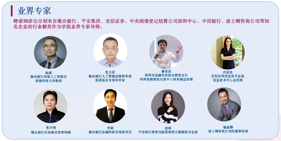 雄厚业界师资实力 - 学院聘请多名金融科技业界大咖与学界知名专家学者作为学院访问教授,同时聘请30多位分别来自微众银行、中央国债登记结算公司深圳中心、中国银行、平安集团、波士顿咨询公司等知名企业的行业精英作为学院业界导师,深度参与学生培养过程中的实践与教学环节。