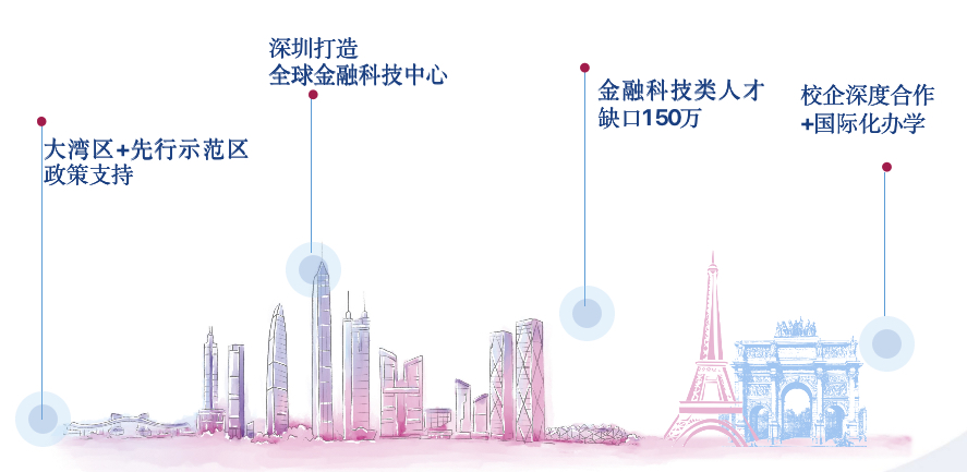 在与微众银行协同培养金融科技专业人才的校企合作成功办学经验的基础上,深圳大学积极探索引入欧洲先进办学理念,创新中外合作办学层次复合型人才培养,与法国南特高等商学院融合中法两校优质教育资源及教学经验,优势互补,以国家战略需求为导向,以产学研战略联盟为平台,重点教授区块链、云计算、大数据、网络安全、人工智能等领域的前沿课程,通过理论知识学习,实践能力培养,外语水平提高,跨文化能力,全面提升学生各项素质与技能,为深圳特区乃至大湾区培养具有国际竞争力和创新意识的复合型人才。深圳作为全国金融科技创模式的先行军,在粤港澳大湾区打造世界级金融科技平台,提升跨境金融服务水平的号召与指引下,在建设保险创新发展试验区,推进深港金融市场互联互通和深澳特色金融合作,开展科技金融试点的规划中,积极打造全球金融科技中心和全球可持续金融中心,建设国际金融枢纽、推进金融开放创新。