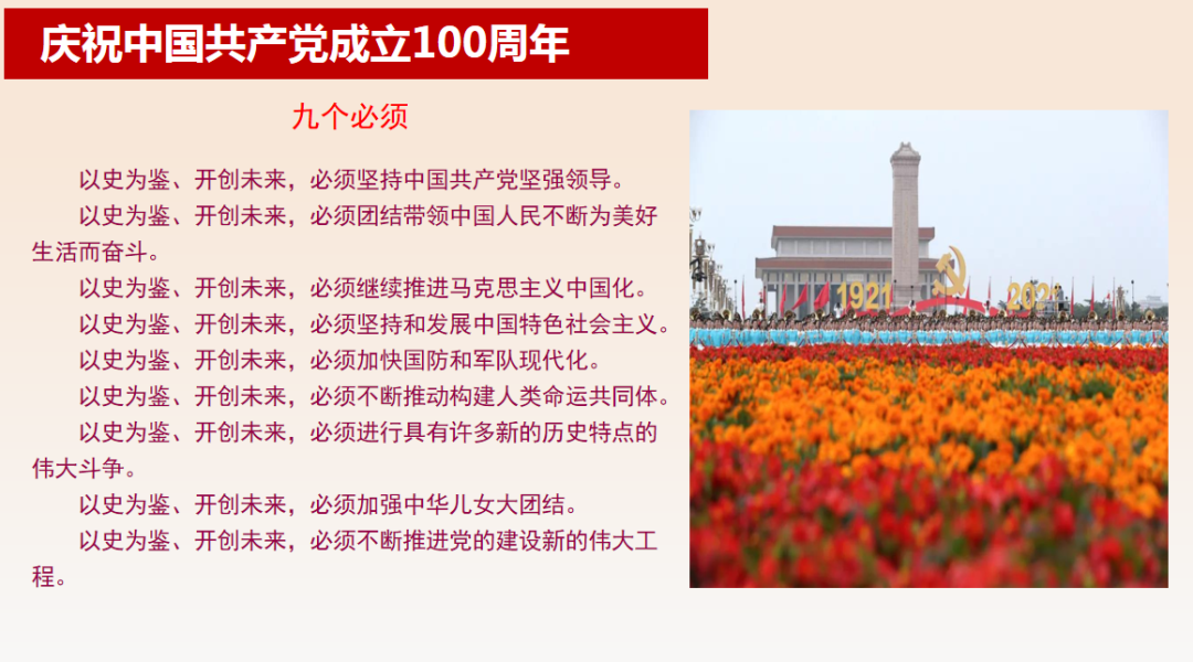 第一、“以史为鉴、开创未来,必须坚持中国共产党坚强领导”,我们必须坚持党对一切工作的领导,包括对高等学校的领导,这是重要前提;第二、“以史为鉴、开创未来,必须团结带领中国人民不断为美好生活而奋斗”,我们必须做好教务管理本职工作,为人民服务,为师生服务,在工作中不要太计较个人得失和“钻牛角尖”,要坚持人民立场和群众路线;第三、“以史为鉴、开创未来,必须继续推进马克思主义中国化”,我们必须做好立德树人工作,做好课程思政工作,让教书和育人同向同行;第四、“以史为鉴、开创未来,必须坚持和发展中国特色社会主义”,我们必须要扎根中国大地办教育,破除“五唯”顽瘴痼疾,追求教育质量的真正提高;第五、“以史为鉴、开创未来,必须加快国防和军队现代化”,我们必须办好军事院校和军事学科专业,培养专业的军事人才;第六、“以史为鉴、开创未来,必须不断推动构建人类命运共同体”,我们必须发挥高校人才培养、科学研究、社会服务、弘扬传统文化和促进国际交流五大职能;第七、“以史为鉴、开创未来,必须进行具有许多新的历史特点的伟大斗争”,我们必须时时刻刻守护好高校意识形态的重要阵地,绷紧意识形态斗争这根弦;第八、“以史为鉴、开创未来,必须加强中华儿女大团结”,我们必须做好少数民族人才培养工作,做好各族学生思想工作;第九、“以史为鉴、开创未来,必须不断推进党的建设新的伟大工程”,我们必须坚持党要管党,从严治党,不断加强教务部基层党组织建设,加强党员同志的先锋模范带头作用。